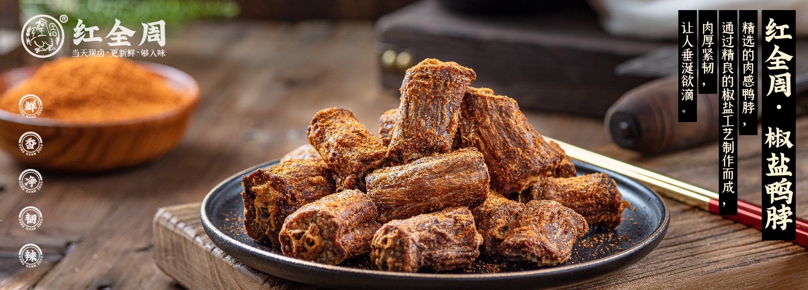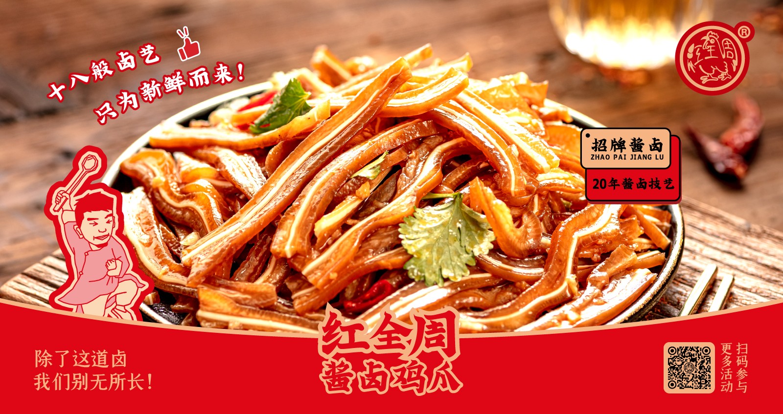 紅全周品牌創立于2012年,其生產總部坐落在以“紅全周雞爪”聞名的福建泉州市南安洪瀨鎮,經張福來師傅多年研制而成的獨家秘方,獨特的鹵制工藝,以“鮮、香、韌、辣”的特點,贏得廣大食客的交口稱贊。紅全周繼承中華美食傳統,堅持以“細微處見風范,毫厘間定乾坤”的服務準則,遵循現代健康飲食理念,精選上等食材,致力為消費者提供安全、健康的美食新體驗。